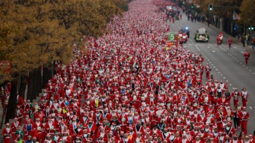 奔跑吧,圣诞老人!西班牙首都马德里近日举行第4届圣诞老人赛跑,逾1万人打扮成圣诞老人参加,打破去年5173人的吉尼斯世界纪录。比赛队伍沿着西甲球队皇家马德里主场班拿贝球场的街道跑5.5公里,场面十分壮观。本次比赛每人参赛费用为12欧元,所有收益捐赠多发性硬化症基金会。