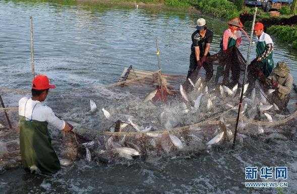台南市学甲区的养殖户在捕鱼,当地已连续多年从大陆对台契作虱目鱼获益。
