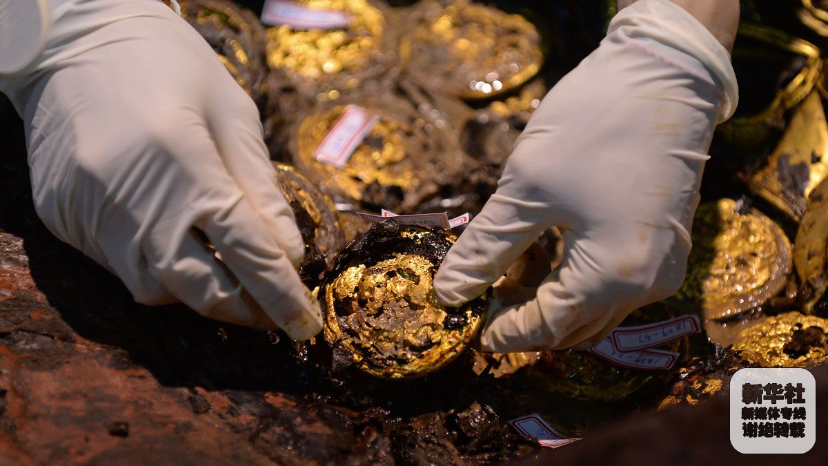 12月24日,考古人员在清理现场提取金饼。 新华网图片 万象 摄