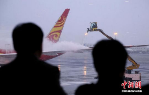 2015年11月6日,北京迎来今冬首场降雪,受降雪天气影响,首都机场部分航班延误。 中新社记者 刘震 摄