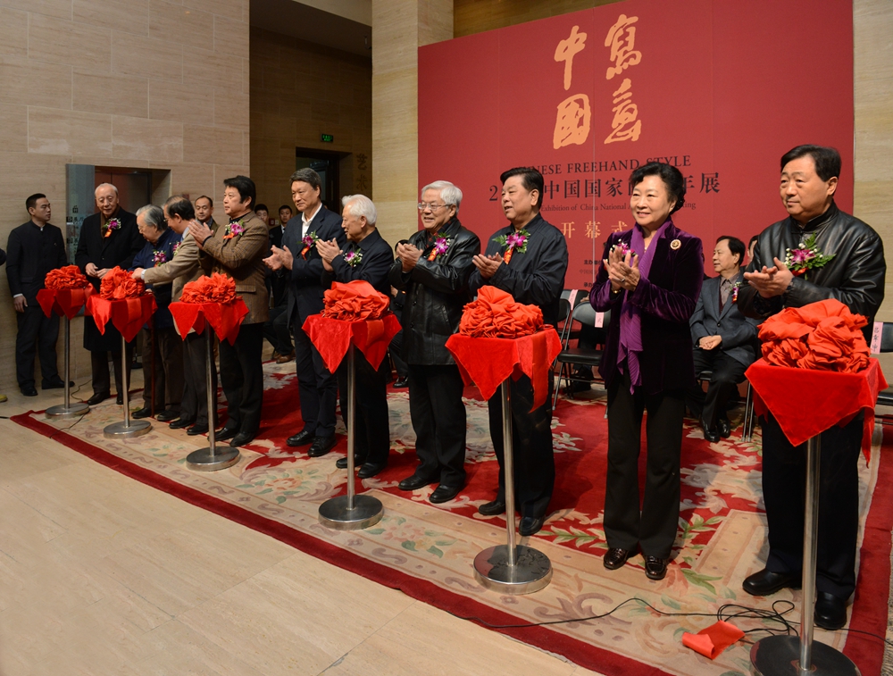 文化部党组成员、副部长董伟,中国美术家协会主席刘大为,老艺术家代表谢志高、杜大恺,中国国家画院院长杨晓阳先后致辞。周铁农、陈宗兴、蔡武、陈存根、赵少华、覃志刚、丁伟、吕章申、刘勃舒、袁运甫、詹建俊为开幕式剪彩。中国国家副院长赵卫向大家介绍了出席开幕式的全国人大、全国政协、文化部、中国文联、中国美协等相关部门领导和嘉宾??皇接芍泄一撼N窀痹撼ぢ硭粗鞒?。