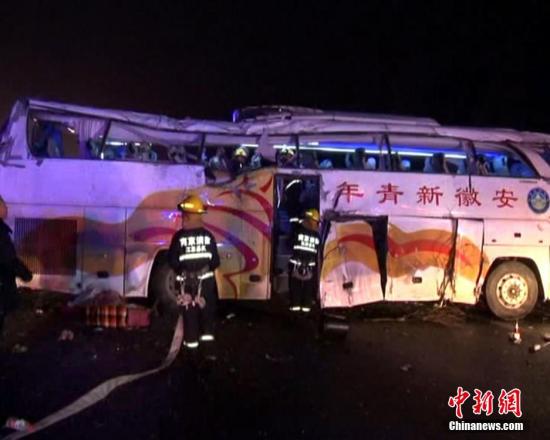 2015年12月25日消息,江苏南京,昨天晚上9点半左右,在宁杭高速上发生一起重大交通事故,一辆大客车刹车失控撞上路中间的隔离栏失控,车上多人被甩出车外,事故造成多人死伤。据了解,这是一辆从上??戏实拇罂统?,当时行驶在宁杭高速上,方向是南京往杭州方向,距离郭庄收费站2公里处,车上共有乘客2、3十人。图片来源:视觉中国