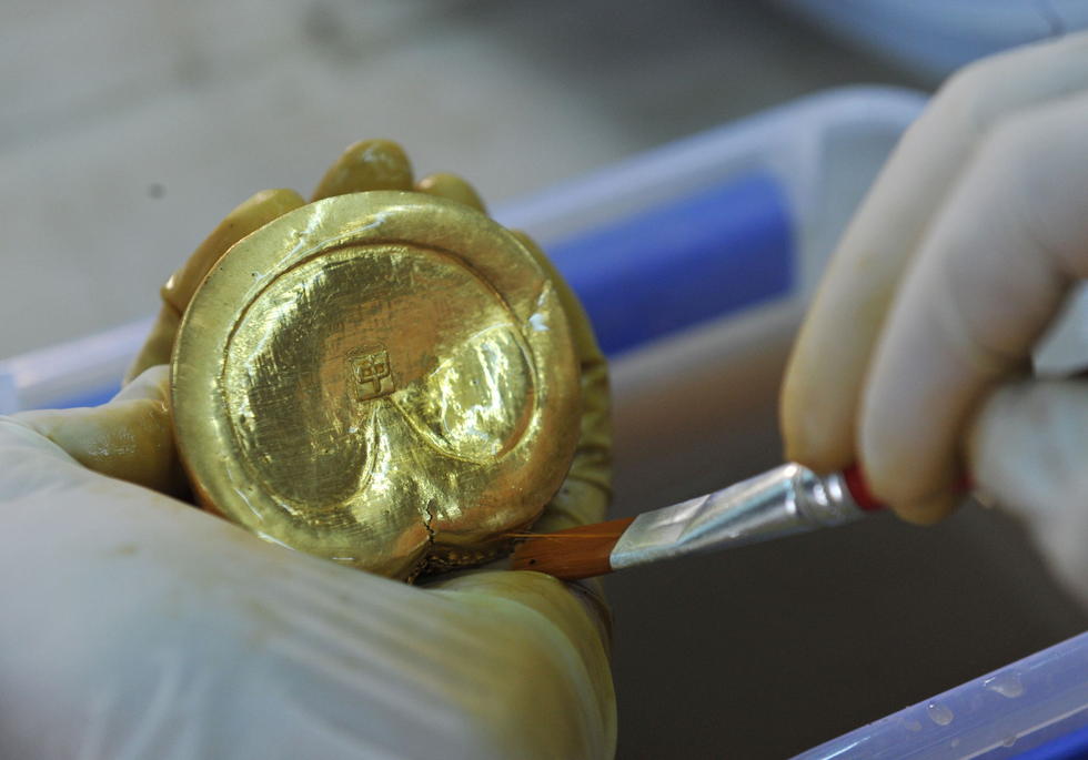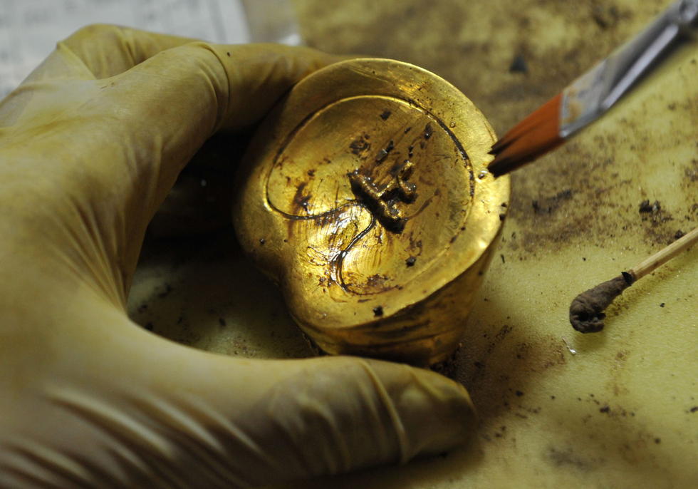 2015年12月27日,江西南昌西汉?;韬钅沟牧偈蔽谋S梅坷铮谋H嗽闭谇謇砬?5日在主棺南侧发现的金板、马蹄金等金器。