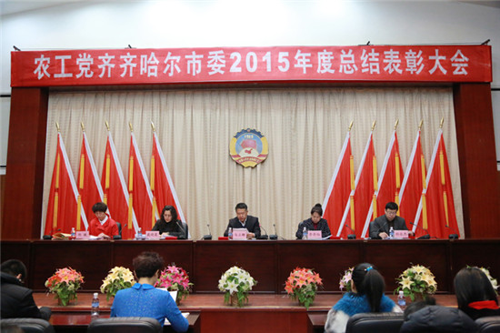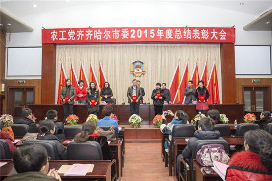 2015年12月26日,农工党齐齐哈尔市委年终总结表彰大会在党政办公中心3号楼政协会议室召开,农工党省委副主委、齐齐哈尔市委主委、齐齐哈尔大学校长马立群,农工党市委副主委、中医院南院副院长戴晓霞,农工党市委副主委、齐齐哈尔大学科技处处长郑永杰,农工党市委秘书长陈曦,以及农工党党员150余人参加了会议。中共市委统战部副部长李丹红应邀出席了会议并讲话。马立群做了题为《学行并举 知行合一 为推进“四个全面”战略布局做出贡献》的工作报告?;嵋橛纱飨贾鞒?。