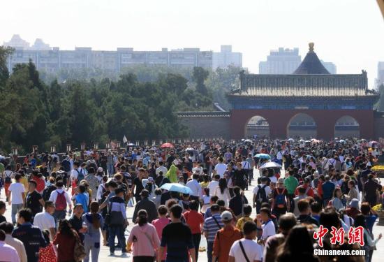 10月3日,国庆黄金周第三天,首都北京风和日丽秋色宜人,天坛公园吸引大量游客前来观光游览、享受假期。中新社发 陈健男 摄 图片来源:CNSPHOTO