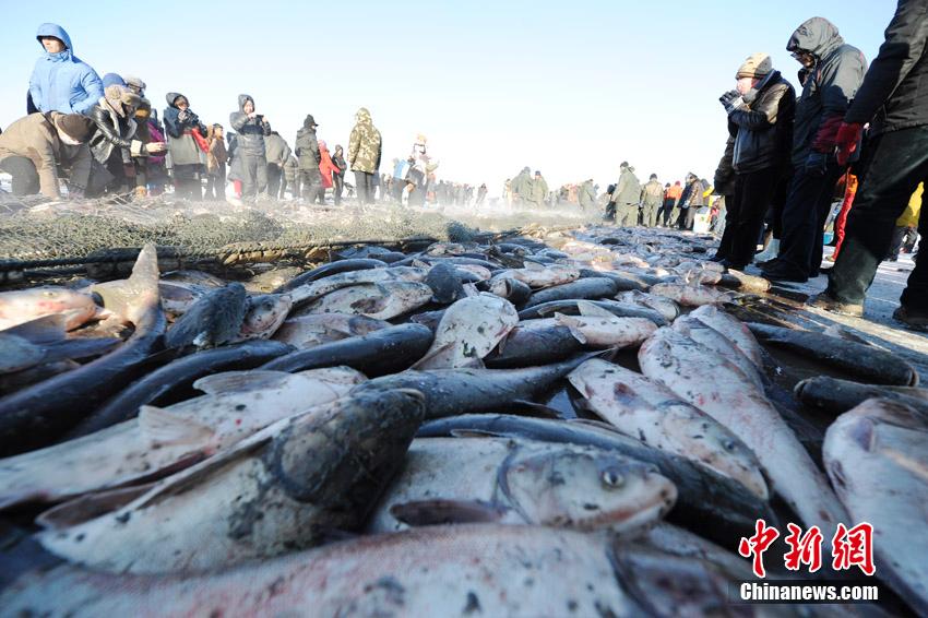 查干湖冬捕一网下去覆盖面积大约在8平方公里左右,每网出鱼量平均7万公斤左右。 张瑶 摄