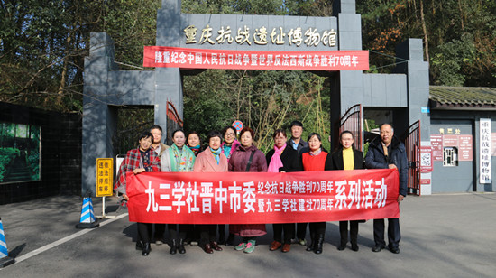 12月的山城重庆处处绿意浓浓,景色怡人,呈现出生机勃勃的景象。青山绿水的重庆具有统一战线的光荣历史和优良传统,是九三学社的发祥地、中国统一战线传统教育基地,也是九三学社全国传统教育基地之一,为激励和引导广大社员,回顾历史,缅怀九三前辈先贤的丰功伟绩,弘扬民主与科学的优良传统,进一步坚定理想信念,增强“三个自信”,推动多党合作事业的可持续发展,在纪念抗日战争胜利暨九三学社建社70周年日子里,九三学社晋中市委于12月17日—19日组织市委委员一行12人赴重庆瞻仰“九三学社成立旧址纪念碑”,参观中国民主党派历史陈列馆、重庆抗战遗址博物馆,重温各民主党派与中国共产党风雨同舟、患难与共的光辉历史,开展“坚定信念、秉承传统、共创未来”的主题教育活动。