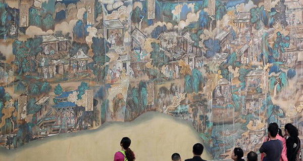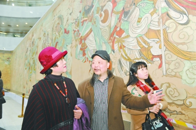 记者昨日在省图书馆二楼看到,4米多高的壁画几乎占满了整个中庭,观众要转好几个弯才能看完全部作品。