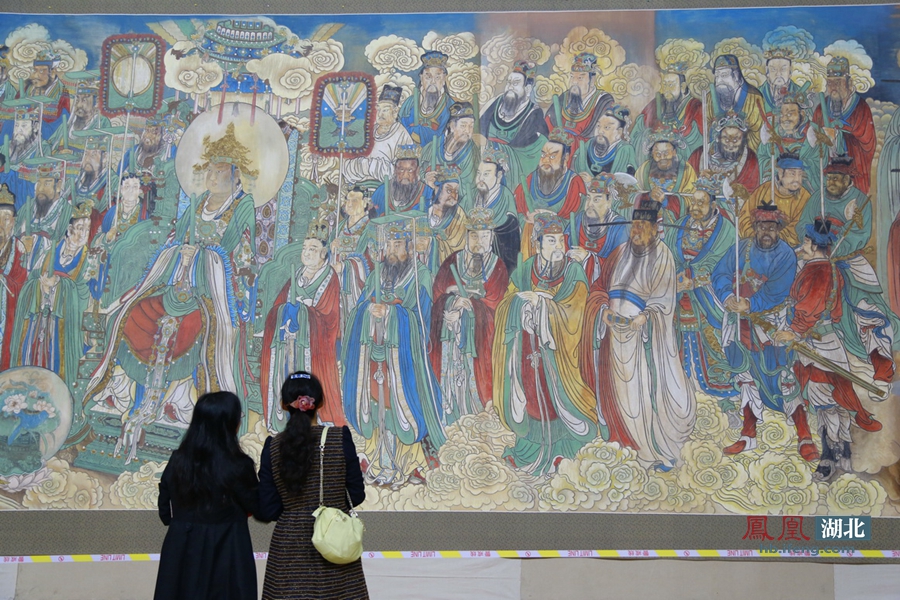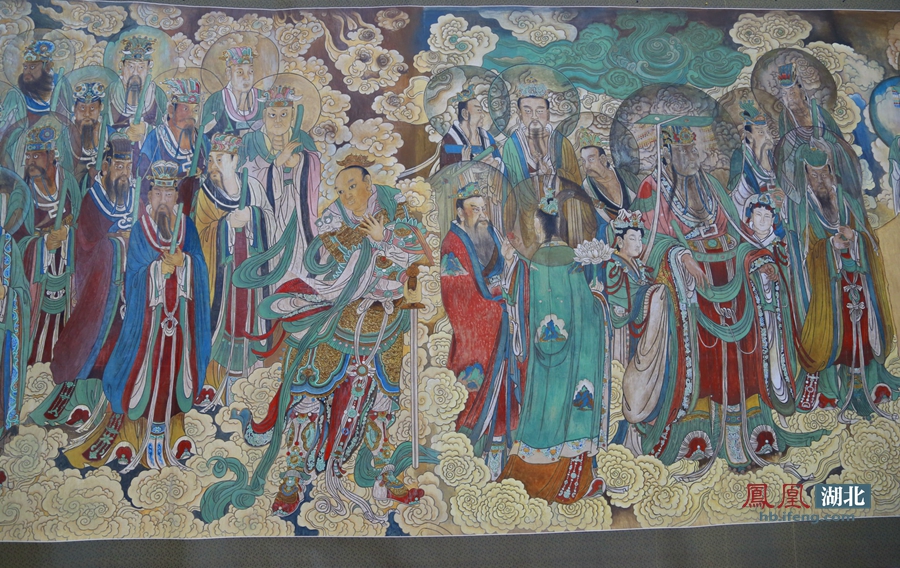 “我临摹完成的作品重达500多公斤,展开后可铺满一个足球场。这件作品共展出3次,因为太大,每次都不能全部展出,这次来武汉的是《朝元图》彩色稿和《纯阳帝君神游显化图》、《四大天王》?!绷跤怪?。