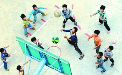 广西大化瑶族自治县板升乡弄勇小学的学生们在课间一起玩投篮游戏。近年来广西把学校体育场地建设和设施器材配备纳入“改薄工程”中,让山区孩子享受更好的教育。新华社发