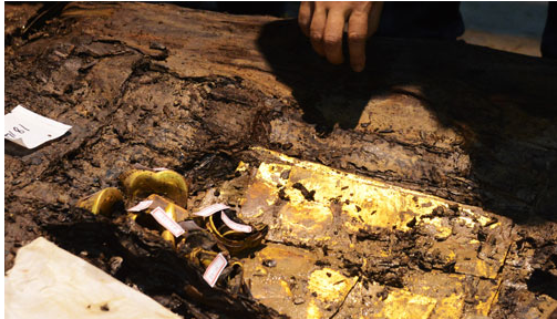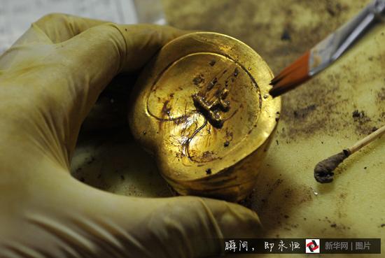 2015年12月27日,江西南昌西汉?;韬钅沟牧偈蔽谋S梅坷?,文保人员正在清理前25日在主棺南侧发现的金板、马蹄金等金器。记者在现在看到,马蹄金分大小两种,大马蹄金分别刻有“上”、“中”、“下”三种文字,对此专家还未得出完整结论。