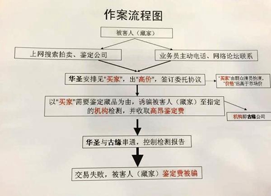 华圣公司通过网络大肆进行宣传推广,雇用了大量员工进行所谓“话术”培训,提高行骗成功率。培训完成后,员工通过网络论坛、电话或微信寻觅被害人,用免费展示、高价代售等方式吸引藏家,随后公司安排买家与卖家直接见面。警方透露,这些“买家”都是该公司雇佣的群众演员,每人每次出场费在300到1200元不等。