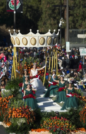 2016玫瑰皇后埃丽卡·卡伦·温特(上)在玫瑰花车游行中向人们挥手致意。