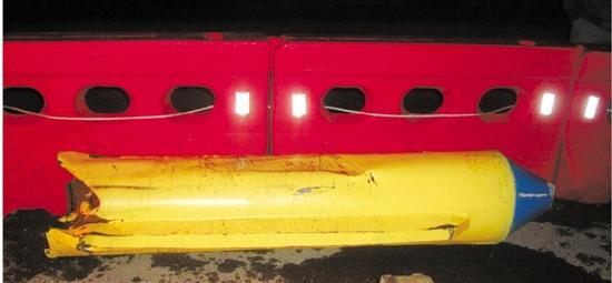 驾驶员邓师傅说,他当时正开着车,前面有一辆半挂车,车上货物用蓬布盖着??斓缴舷?,蓬布未盖紧的地方,突然飞出来一个黄色的东西,很像导弹头。由于离得过近,邓师傅来不及避让,“导弹头”直接钻到他车底了,然后只听“嘭”的一声,车子就动不了了。