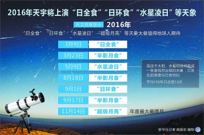 关键词:2016年天象预测 2次日食 3次半影月食 水星凌日