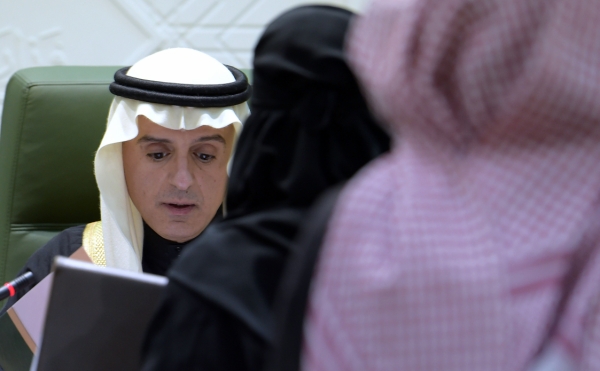 1月3日,在沙特首都利雅得,沙特外交大臣朱拜尔在记者会上讲话。