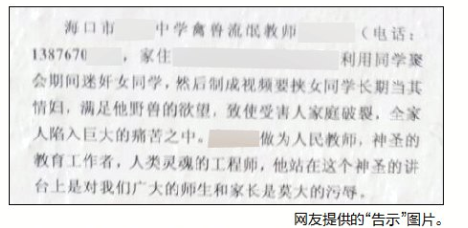 近日,有网友向南国都市报新媒体报料平台报料称,有人在??谀持醒趴谡盘徽鸥媸境?,该校一名朱姓男教师,利用同学聚会迷奸女同学,导致其家庭破裂。3日,南国都市报记者和该朱姓教师取得联系,该教师对此予以否认,并称这是有人在制造谣言想败坏他的名声,但该教师并未表态是否已报警,并称自己也知道是谁张贴的。