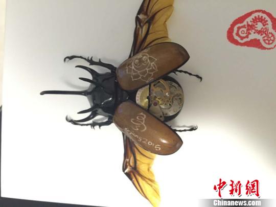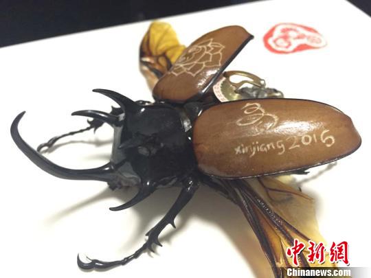 马驰使用的虫子标本,是来自泰国的兜虫,也就是金龟子。这种昆虫由于翅膀上有一层蜡质油迹,不仅表面光滑,字墨也难以沁入。昆虫标本在转动起来的时候,特别容易滑动到其他的位置,所以手一定要特别的稳。