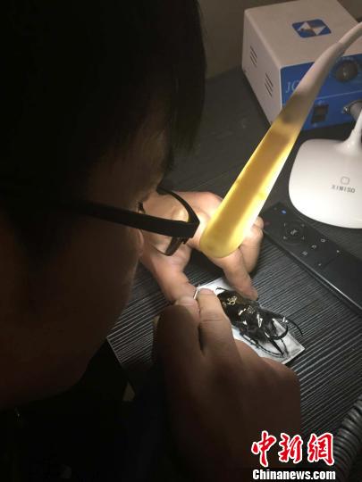 正埋头在昆虫羽翅上作画马驰说,在昆虫翅膀上面作画的时候不能打草稿,他们都是根据电脑上的放大图片,按照比例,一点一点、由轻到重的去雕。刚开始学习的时候,只要稍微一用劲,整个画作就“花”了,虫子就只有报废。