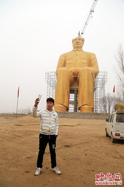 记者在现场看到,这座雕像坐北朝南,毛主席呈坐立状,由钢筋和水泥筑成,外面一层被涂上了金色漆,旁边还有脚手架,不时有群众开车慕名到来,在毛主席像前拍照留念。