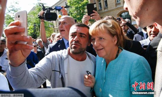 资料图:柏林的一处难民营外,一位移民拿起手机与默克尔自拍合影?! ?/p>