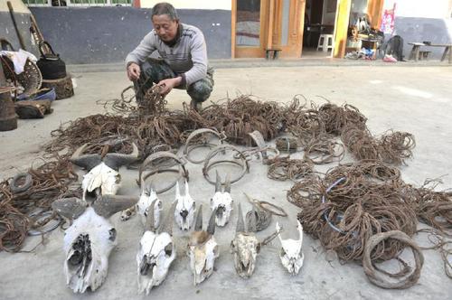 在绵延200多公里的九顶山脉上,10万个钢丝套似乎并不密集,然而,就是这些构造简单的钢丝套,在10余年的时间里,几乎灭绝了九顶山上的野生动物。余家华家里的钢丝套堆上,还放着很多动物头骨?!岸际俏颐遣鹛鬃邮保以谏厦嫠懒说??!庇嗉一阉堑耐仿窕乩?,作为九顶山旧日伤痕的见证。