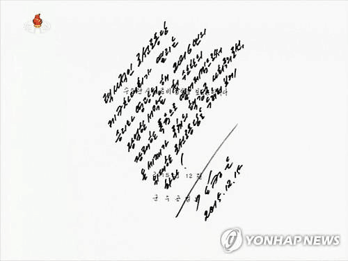朝鲜电视台公布金正恩指示进行氢弹试验亲笔签名