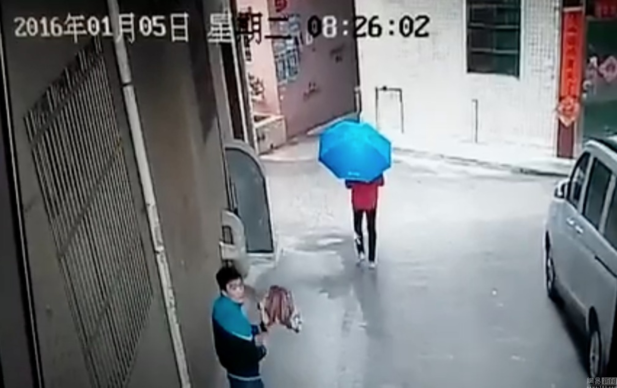 2016年1月5日消息,广东东莞,5日上午,一段抢劫的视频在东莞当地朋友圈传得沸沸扬扬。视频显示,当日上午在东莞寮步镇凫山村的居民楼下,两名男子对一个年轻女子锁喉、抢劫、摔地,并在抢劫得手之后离去。目前,当地警方已经立案侦查。图为视频显示:2015年1月5日早上8点25分44秒,下着蒙蒙细雨,三名男子骑着一辆女士摩托车,从一个居住楼的三叉路口驶出,骑车的男子穿着蓝色雨衣,中间男子撑着一把蓝色雨伞,三名男子面部表情很兴奋。