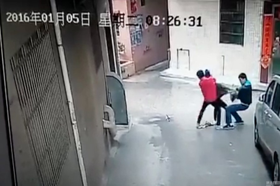 据被抢女子的奶奶介绍,其孙女姓黄,今年24岁,在湛江上的大学,毕业没多久,在松山湖一加工公司上班,事发时,黄小姐正准备去上班,离开家才100多米,而她的男朋友就在巷口外面的兴山路上等着她。图为抢劫画面视频截图。(视频翻拍)陈奕启
