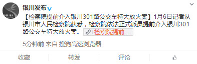 中新网1月6日电 据银川市委外宣办、市政府新闻办官方微博“银川发布”消息,检察院提前介入银川301路公交车特大放火案。