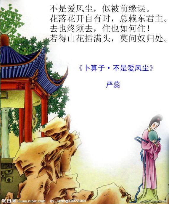 后来,朱熹改任别的官职,被调离了浙江。这时任御史的岳霖专管审理各级官员的违纪案件。他再复查此案时,十分同情严蕊的遭遇,借庆贺元旦的机会,命严蕊当场填词表白自己。被折磨得十分虚弱的严蕊不用思考,立即口吟一首词《卜算子》:“不是爱风尘,似被前缘误。花落花开自有时,总赖东君主。去也终须去,住也如何住。若得山花插满头,莫问奴归处?!痹懒靥靼琢搜先锎手械男脑浮M竦么恿嫉幕?,立即下令释放严蕊从良。