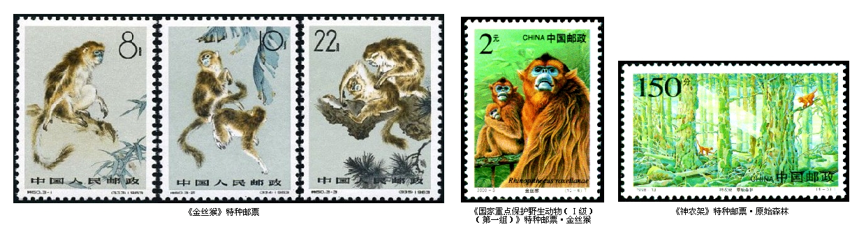 2000年2月25日发行的《国家重点?;ひ吧铮á窦叮ǖ谝蛔椋诽刂钟势?,其中第六枚图案为金丝猴;1998年6月6日发行的《神农架》特种邮票第三枚“原始森林”,图案中有两只金丝猴在森林里出没。这是我国邮票中的5枚金丝猴“猴票”。