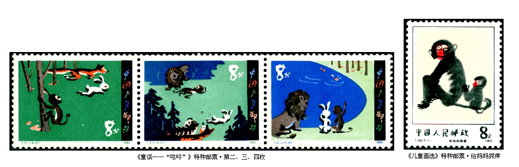 猴是孩子们心目中最喜爱的动物之一,那些民间杂耍艺人牵着走街串巷的猴子,动物园笼子里上窜下跳的猴子,都要招来孩子们的围观。在我国发行的儿童题材邮票中曾两次出现过猴。1980年6月1日发行的《童话——“咕咚”》特种邮票,其中第二、三、四枚图案出现一只盲目跟着兔子被“咕咚”吓得乱跑的小猴子;1983年6月1日发行的《儿童画选》特种邮票,其中第一枚“给妈妈抓痒”,这幅作品是出自壮族小姑娘王亚妮之手的写意水墨画,一只小猴在给猴妈妈后背挠痒痒,画面中的母子猴惟妙惟肖、栩栩如生。这是我国儿童题材邮票中的4枚“猴票”。