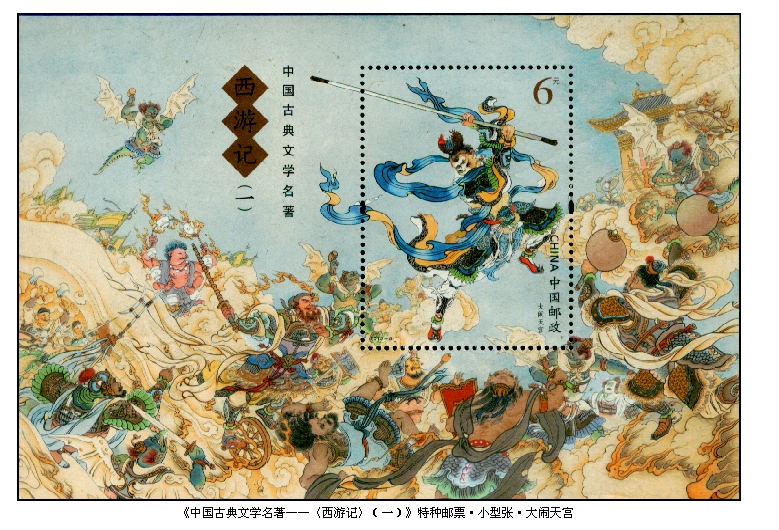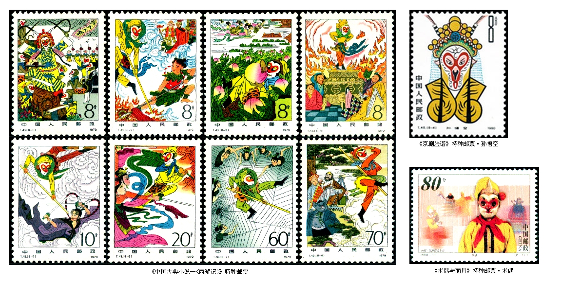 猴在我国传统文化中占有一定位置,明代作家吴承恩在《西游记》中为我们塑造了善良勇敢、机智灵活的美猴王孙悟空的形象,使猴子更加受到人们的喜爱。1979年12月1日发行的《中国古典小说——西游记》特种邮票,全套8枚,图案分别是“水帘洞”“战哪吒”“蟠桃园”“八卦炉”“打白骨”“芭蕉扇”“盘丝洞”和“取经路”。全套邮票尤如微型连环画,将孙悟空的形象跃然于方寸之上,深受广大集邮爱好者的青睐,1980年也被评为建国30年最佳邮票;1980年1月25日发行的《京剧脸谱》特种邮票,其中第四枚图案为孙悟空的脸谱;2000年10月9日与巴西联合发行的《木偶与面具》特种邮票,其中第一枚“木偶”,图案是中国泉州提线木偶剧中的孙悟空;2014年6月1日发行的《动画———〈大闹天宫〉》特种邮票,全套6枚根据上海美术电影制片厂1961年摄制的同名动画片中经典故事情节绘入邮票,再现了孙悟空勇猛矫健的艺术形象,图案分别是“龙宫夺宝”“官封弼马温”“自封齐天大圣”“大闹蟠桃园”“恶斗天兵天将”和“打上灵霄殿”;2015年5月3日发行的《中国古典文学名著———〈西游记〉(一)》特种邮票,全套4枚,小型张1枚,这是我国重新发行古典文学名著《西游记》邮票的第一组,图案分别是“自封齐天大圣”“佛祖降悟空”“发愿取真经”和“悟空收心”,小型张“大闹天宫”。除第二枚“发愿取真经”没有出现孙悟空外,其它3枚和小型张都有孙悟空。这是我国邮票中有关《西游记》美猴王孙悟空的20枚“猴票”。