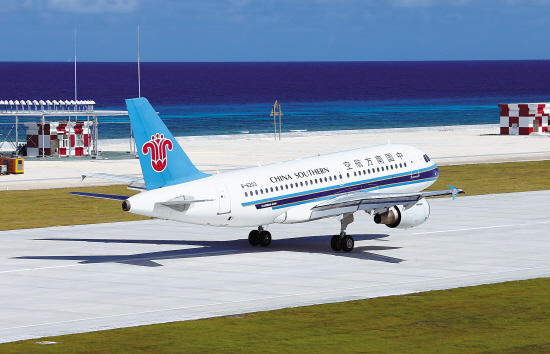 昨日10时21分,南方航空的飞机降落南沙永暑礁新建机场。