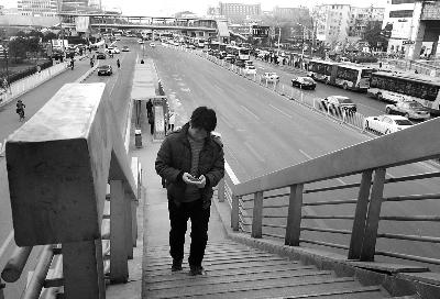 在天桥的一个出口处,边看手机边走上台阶的靳强脚抬得稍低,没有跨到最上层台阶,打了个趔趄,猛向前大跨几步后才站稳。