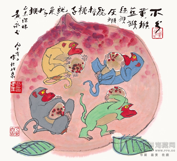 黄永玉想两张画有所区别,一幅,就画一只调皮的猴,一只手抓住树枝,尾巴吊在树上,另一只手捧着红艳的桃子,捧桃献瑞,寄寓吉祥。另一幅,他想画出阖家欢乐的场面,“抱一只猴子太冷清了,抱两只不是更好玩嘛?!崩罨运?。