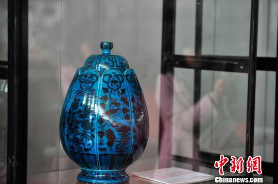 图为展出的“孔雀蓝釉花鸟虫贝盖罐”。 刘冉阳 摄
