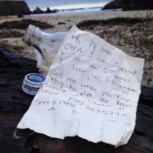 男童莱德(Ryder Goggin)于去年在门多西诺郡海滩(Mendocino)发现一个瓶中信,打开玻璃汽水罐,里头信中写道“嗨,我叫克里斯,今年10岁,读小学5年级,住在沙加缅度(Sacramento),如果你发现了这封信,请你跟我联络,让我知道它是在哪里被冲上岸的?!辈⒃谧詈蟾缴先掌凇?988年9月5日”和电话号码。