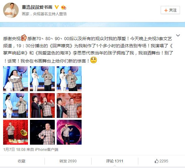 人民网1月8日电 昨天,央视著名少儿节目主持人董浩在个人微博透露今年即将退休的消息,央视文艺频道《回声嘹亮》节目还特意为其制作了一期退休告别专场。