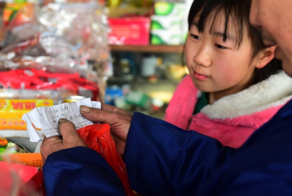 一位小顾客向吕忠彬出示购物单(1月7日摄)。