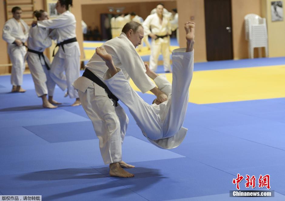 普京视察俄柔道国家队南部训练中心,期间与伦敦奥运会柔道冠军等顶尖高手同台切磋技艺。