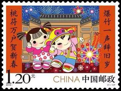 1月10日,中国邮政发行《拜年》特种邮票1套1枚,邮票面值为1.2元。这是中国邮政再次发行以“拜年”为主题的邮票?!栋菽辍酚势被嬉浴盎痘?、喜喜”两个卡通形象为主要元素,“欢欢”戴着“猴帽”左手高举竹竿,竹竿上挂着火红的正在燃放的鞭炮,炮花如绽放的春之花,绚丽多彩;“喜喜”双手捂耳,一脸喜悦,笑逐颜开。两侧吉祥如意的对联:“爆竹声声辞旧岁,桃符户户贺新春”,由我国著名书法家欧阳中石所题。