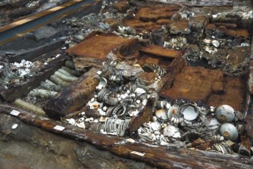 出土文物中最多的是瓷器。刘成基介绍:“瓷器主要是当时南方著名窑口的产品,大部分源自江西、福建和浙江。金银铜锡和漆木器等其他发现也非常重要,金页、银铤上多有店铺名称、重量、地名等戳记,反映了南宋时期商品经济异?;钤荆蜒由斓胶M饷骋琢煊?。”