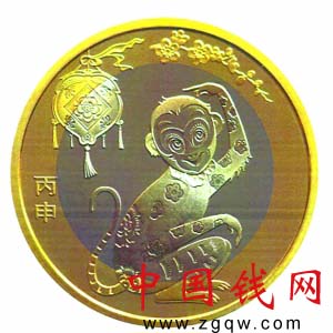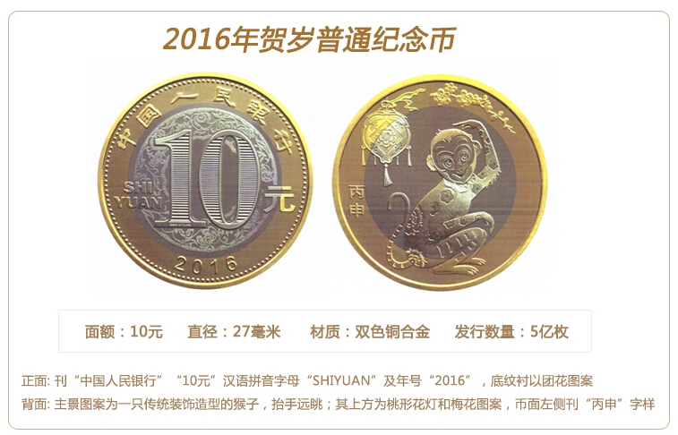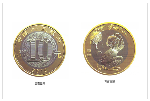 据了解,猴年普通纪念币正面刊“中国人民银行”、“10元”、汉语拼音字母“SHIYUAN”及年号“2016”,底纹衬以团花图案。背面主景图案为一只传统装饰造型的猴子,抬手远眺;其上方为桃形花灯和梅花图案,币面左侧刊“丙申”字样。
