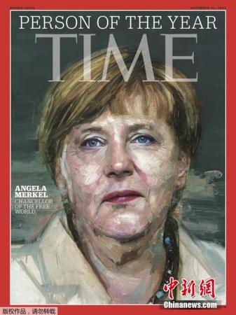 资料图:2015年12月9日,美国《时代》周刊宣布2015年度风云人物为德国总理默克尔,赞扬她在欧洲主权债、难民和移民及俄罗斯干预乌克兰等?;诩渌瓜值牧斓寄芰?。