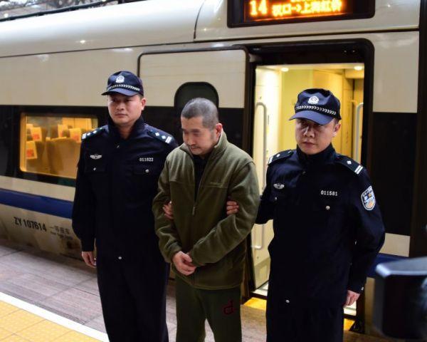 资料图:2015年11月18日,在汉口火车站,犯罪嫌疑人王某在警方押送下抵达武汉。据武汉警方介绍,嫌疑人王某是“猎狐行动”开展以来,武汉首个自愿从西方国家回国自首的境外逃犯。此前,追逃专班曾先后10次派人登门探望慰问王某父母,解决其生活困难。新华社记者 饶饶 摄