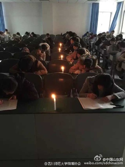 1月12日下午,四川师范大学因故障全面停电,有些考试的学生不得不点起蜡烛接着考。网友称,此情此景不禁想起小时候,教室停电了,我们也是点着蜡烛上课的。图为考生点蜡烛考试。