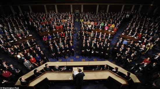 奥巴马入场后向国会议员问新年好,随后在演讲开始时,奥巴马戏言:我不会讲太久。