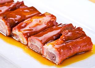 排骨烤熟后,用220℃上色5分钟,剪去黑色部分,待稍凉后淋上糖胶,再200℃回炉烧约5分钟,取出稍凉后再次淋上糖胶即可。